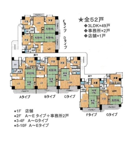 全52戸(3LDK×49戸、事務所×2戸、店舗×1戸)からなる収益マンションで、現況利回りは約5.5%。
