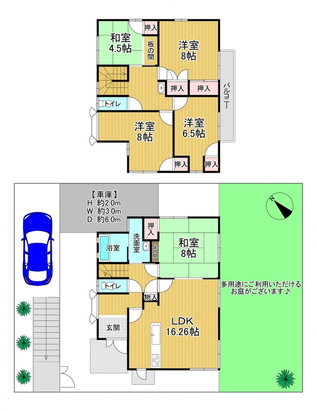 土地面積広々約70坪♪ お部屋たくさん5LDKのオール電化住宅♪ お車2台駐車可能♪ 南東側の広々としたお庭で家庭菜園等♪